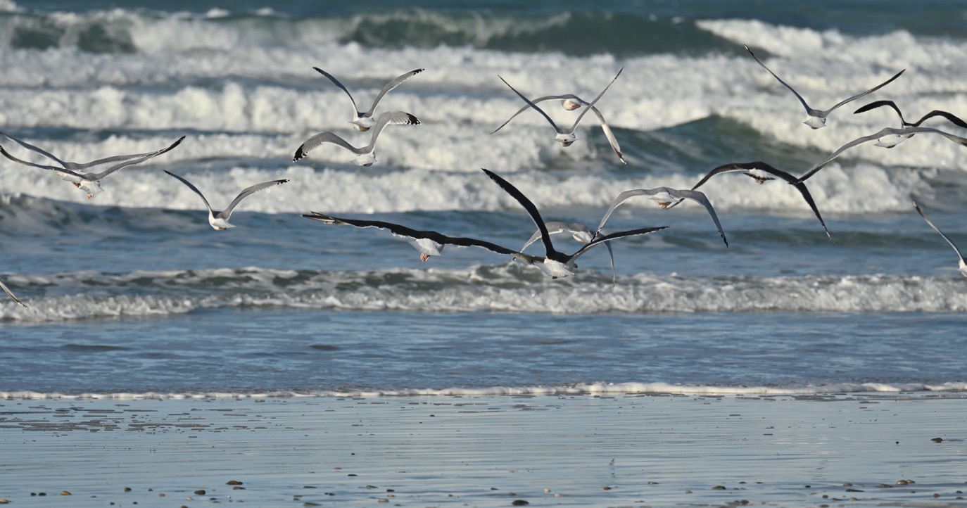 Envol de goélands bruns et marins